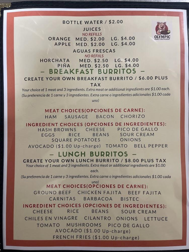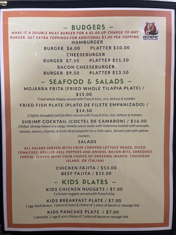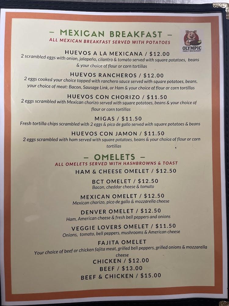 The menu at Olympic Family Restaurant offers a delightful mix of American and Mexican dishes, appealing to diverse palates. Breakfast options like huevos rancheros and migas showcase the Mexican influence, perfect for starting the day right.